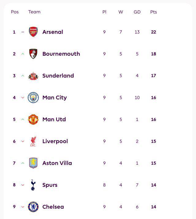英超第9轮,积分榜形势大变。伯恩茅斯2比0力克正在经历赛季三次换帅阵痛的诺丁汉森林,各线连续7场不败,18分暂列积分榜第2,身后则是17分的升班马桑德兰,黑猫军团客场2比1爆冷击败豪门切尔西,迎来两连胜,将曼市双雄踩在脚下。