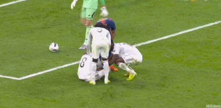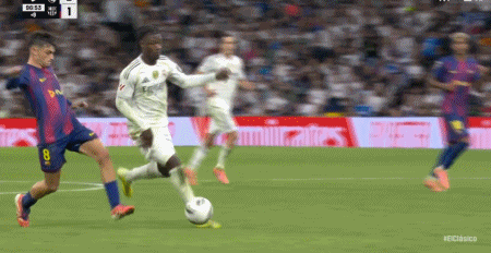 第42分钟,佩德里奋力拉拽维尼修斯球衣,得到一张黄牌