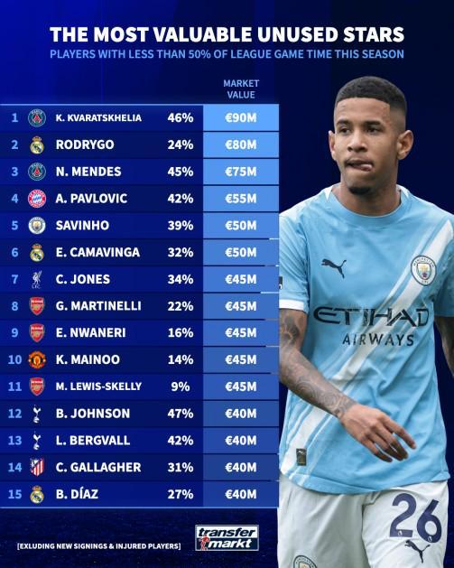 北京时间11月12日,德转统计出了本赛季至今联赛出战比例不足50%,身价排名前15的球员,克瓦拉茨赫利亚、罗德里戈以及努诺-门德斯位列前三。